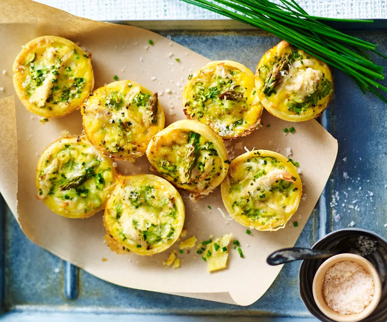 Top with egg mixture; sprinkle with parmesan. Bake 25 minutes or until quiches are set and pastry is browned lightly. Serve warm.